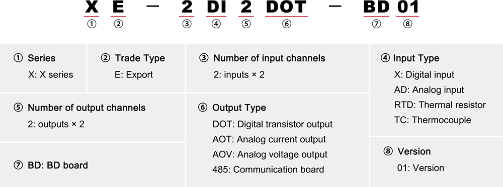 | 8 | XE-1AI1RTD-BD | 1AI、16ビット電流タイプ。 一方向熱抵抗器、PT100 をサポート | アナログ入力×2、RTD入力×1 |